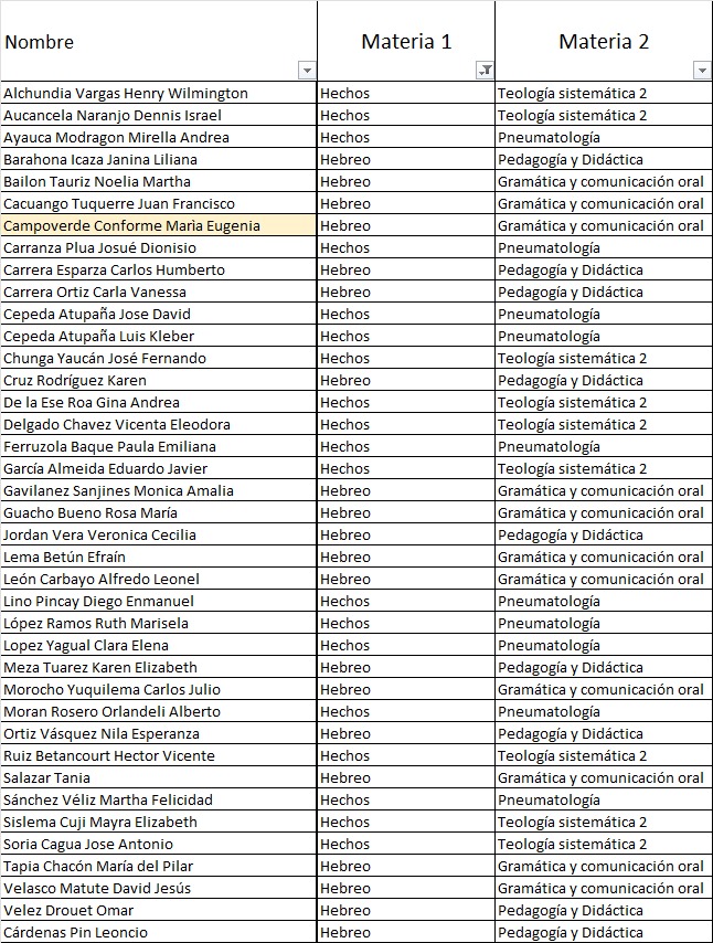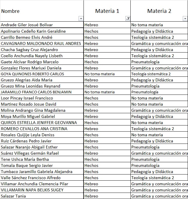 Escoja su modalidad de estudio, busque su nombre y mire que materias debe tomar este bimestre. Si su nombre no está en la lista o solo tiene una materia, comunÃquese con nosotros para solucionar su caso al 0995322800. Revise la lista y luego vaya al aula virtual a registrarse.